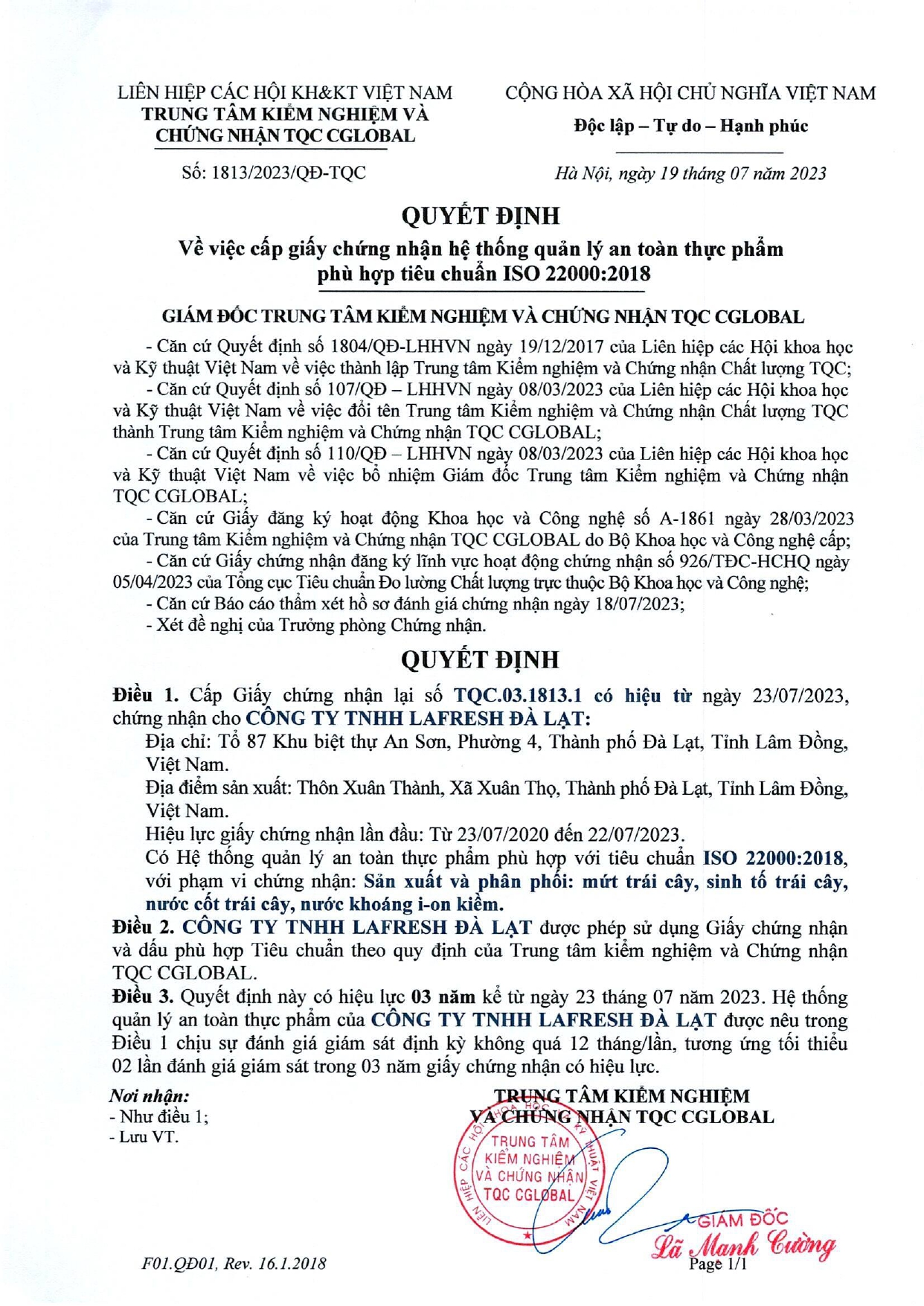 Giấy chứng nhận hệ thống quản lý an toàn thực phẩm phù hợp tiêu chuẩn ISO 22000:2018