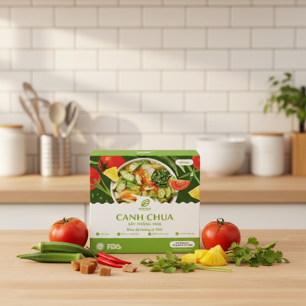 eSoup Canh chua là giải pháp canh ăn liền đột phá, sử dụng công nghệ sấy thăng hoa hiện đại để giữ trọn vẹn hương vị chua thanh, thanh đạm và dưỡng chất tự nhiên của nguyên liệu tươi.