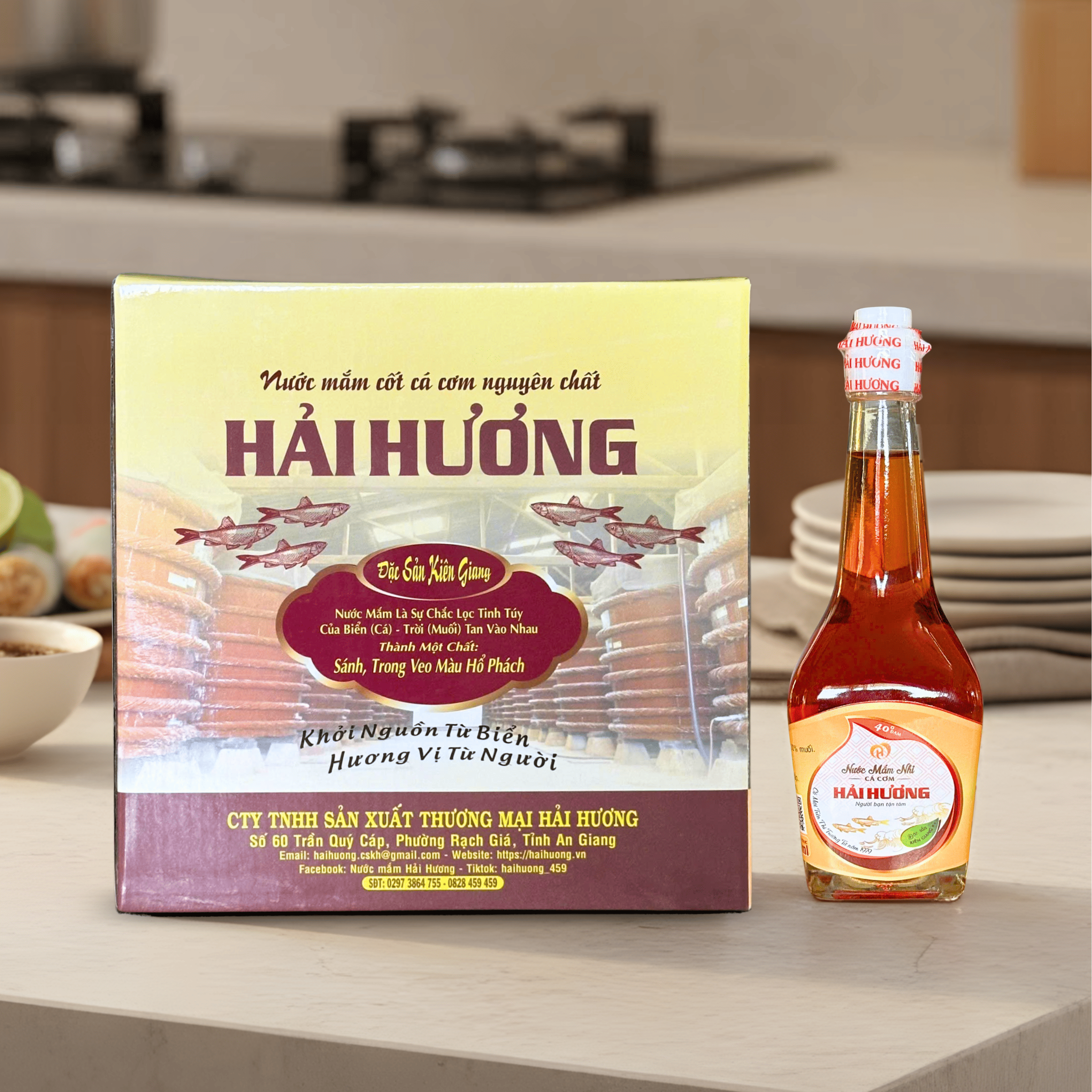 Nước mắm Hải Hương là thương hiệu gắn liền với hơn 50 năm gìn giữ và phát triển nghề làm mắm truyền thống tại Kiên Giang. Được chế biến từ cá cơm tươi ngon kết hợp cùng muối biển sạch, ủ chượp theo công thức gia truyền, mỗi giọt nước mắm Hải Hương sở hữu sắc vàng óng tự nhiên, hương thơm thuần khiết và vị mặn ngọt hài hòa đặc trưng. Sản phẩm hoàn toàn không sử dụng phẩm màu, chất bảo quản hay hóa chất độc hại, giữ trọn sự nguyên bản của biển cả trong từng bữa ăn.