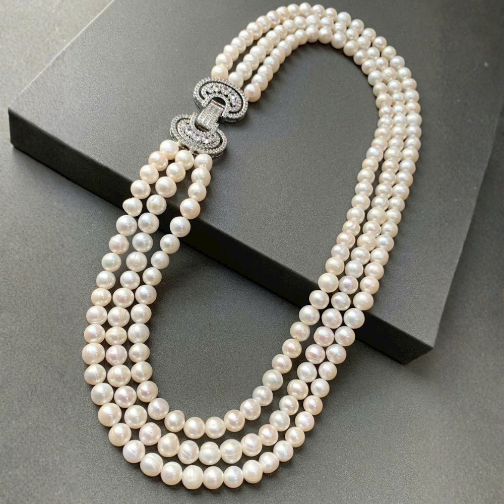 Dây chuyền ngọc trai 3 tầng là một món trang sức được thiết kế đặc biệt, nổi bật với sự kết hợp của ba chuỗi ngọc trai, mang lại vẻ ngoài sang trọng, quý phái và cổ điển cho người đeo.