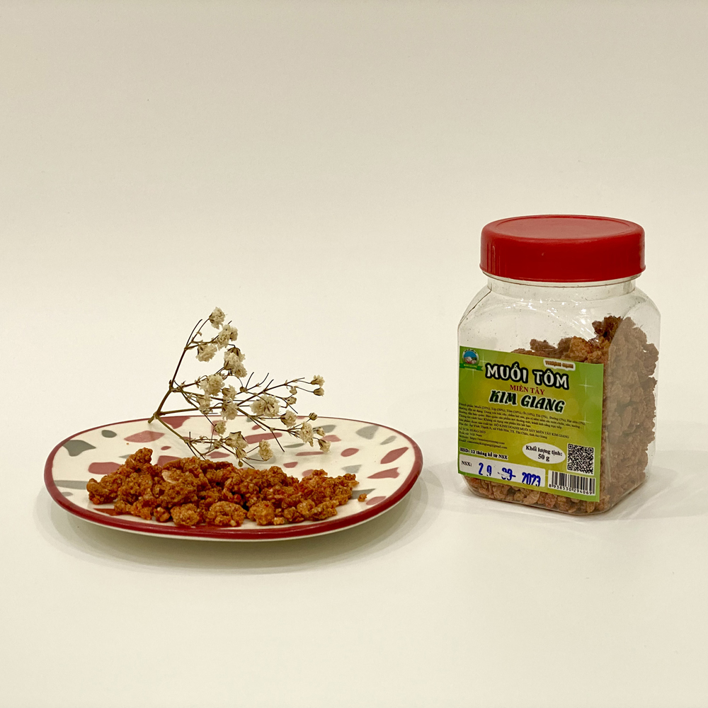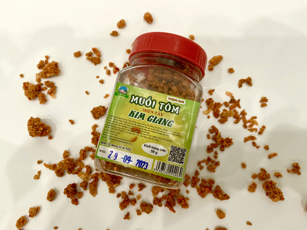 Muối tôm sấy miền Tây Kim Giang có thành phần từ muối, tôm, tép, tỏi, ớt, đường, hạt nêm. Đây là sản phẩm có mùi thơm đặc trưng và hương vị đậm đà, hạt muối to, có màu sắc vàng, khi nhìn vào vô cùng hấp dẫn. Sản phẩm còn phù hợp cho mọi lứa tuổi sử dụng.