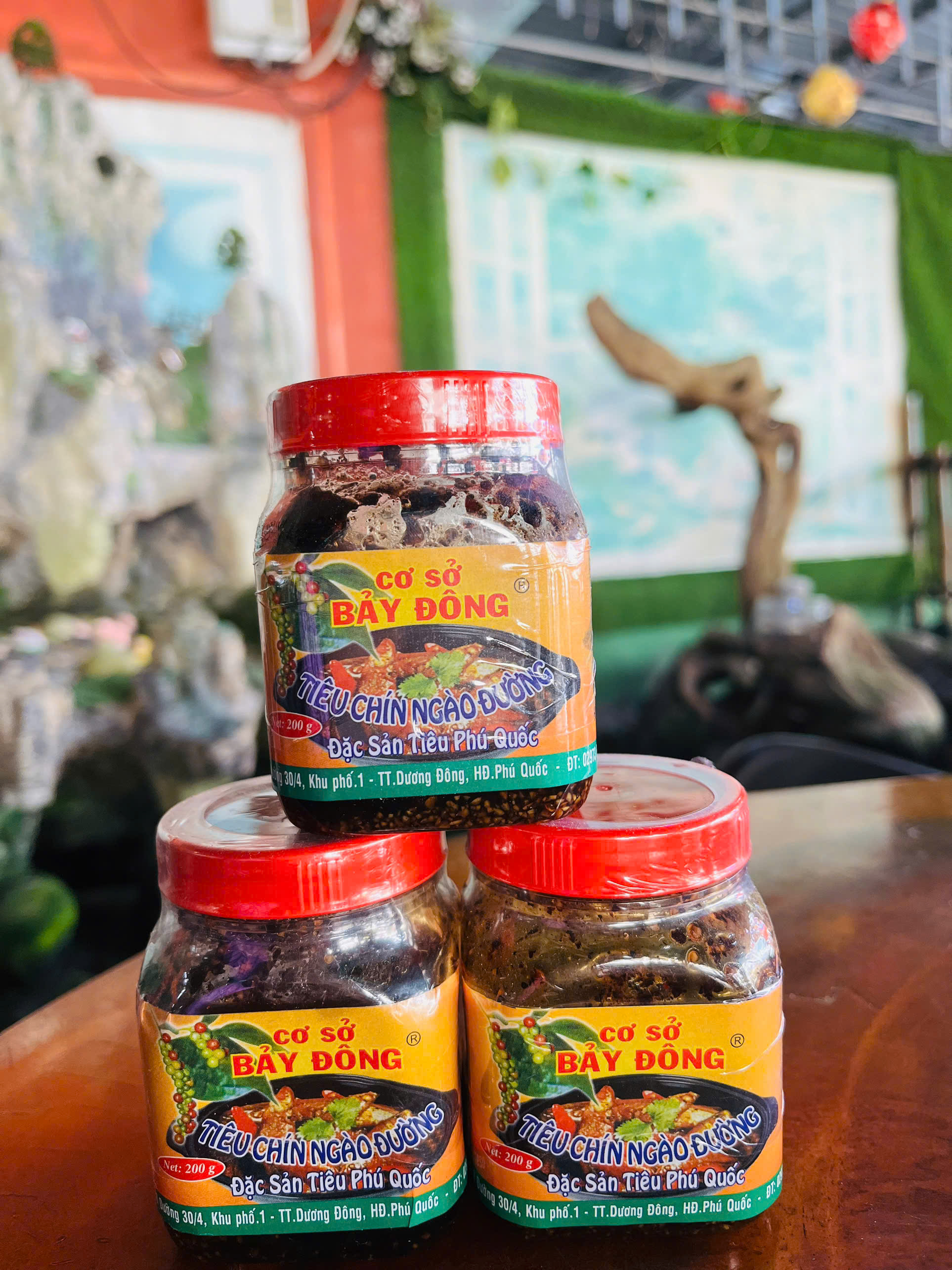 Tiêu chín ngào đường là sự hòa quyện hoàn hảo giữa tiêu chín tự nhiên và vị ngọt của đường, mang đến một món ăn vừa cay nhẹ, vừa ngọt thanh, thơm lừng đặc trưng. Sản phẩm là đặc sản Phú Quốc với hương vị truyền thống của miền quê Việt Nam, gợi nhớ sự ấm áp của bữa cơm gia đình xưa. Tiêu được chế biến thủ công tỉ mỉ: chọn lọc từng hạt tiêu chín, ngào với đường trên lửa nhỏ cho đến khi sánh lại, ngấm đều, dẻo nhẹ và có màu nâu óng ánh hấp dẫn. Không sử dụng hóa chất hay chất bảo quản nên sản phẩm vẫn giữ được vị ngọt tự nhiên, an toàn và giàu giá trị dinh dưỡng.