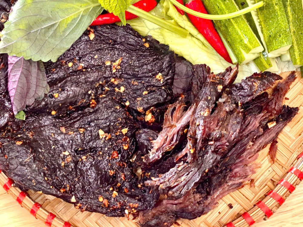 Khô bò vị Tây Bắc là một món ăn vặt hấp dẫn, mang hương vị đặc trưng của vùng Tây Bắc Việt Nam. Món này được làm từ thịt bò tươi, tẩm ướp với các loại gia vị đậm chất núi rừng như mắc khén, hạt dổi, gừng, tỏi, ớt và một số loại thảo mộc khác. Sau khi ướp,