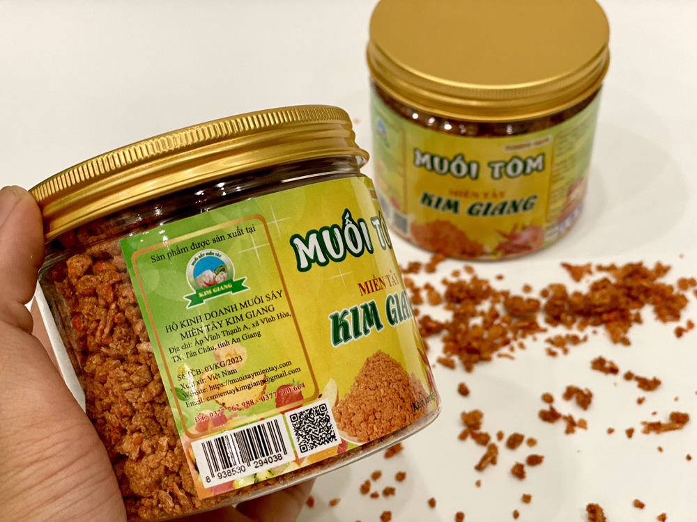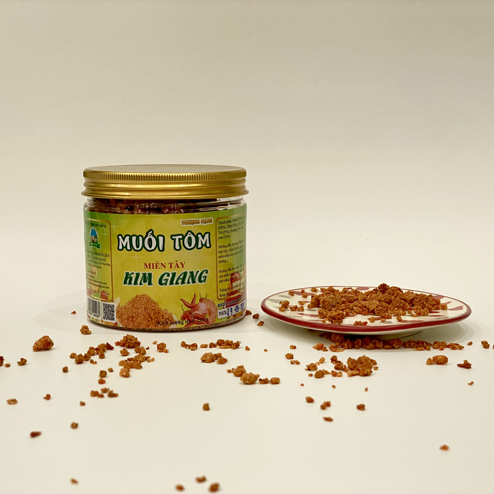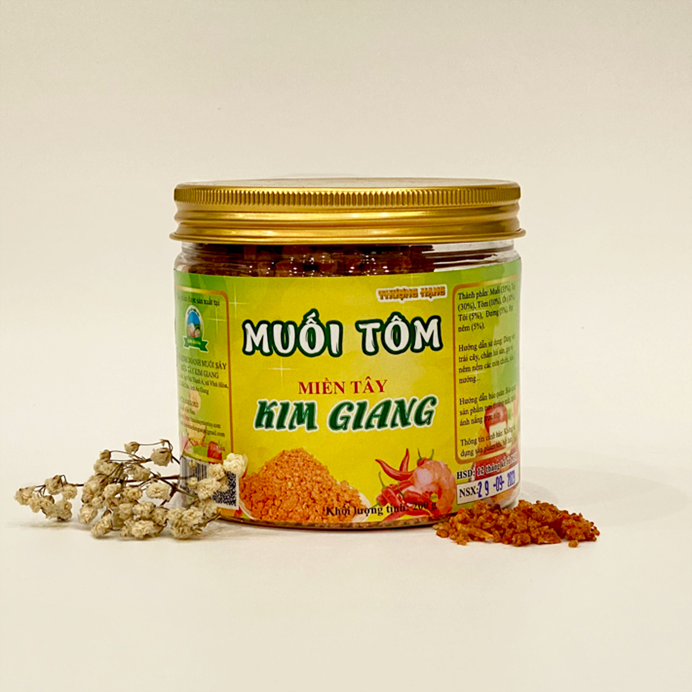 Muối tôm sấy miền Tây Kim Giang có thành phần từ muối, tôm, tép, tỏi, ớt, đường, hạt nêm. Đây là sản phẩm có mùi thơm đặc trưng và hương vị đậm đà, hạt muối to, có màu sắc vàng, khi nhìn vào vô cùng hấp dẫn. Sản phẩm còn phù hợp cho mọi lứa tuổi sử dụng.