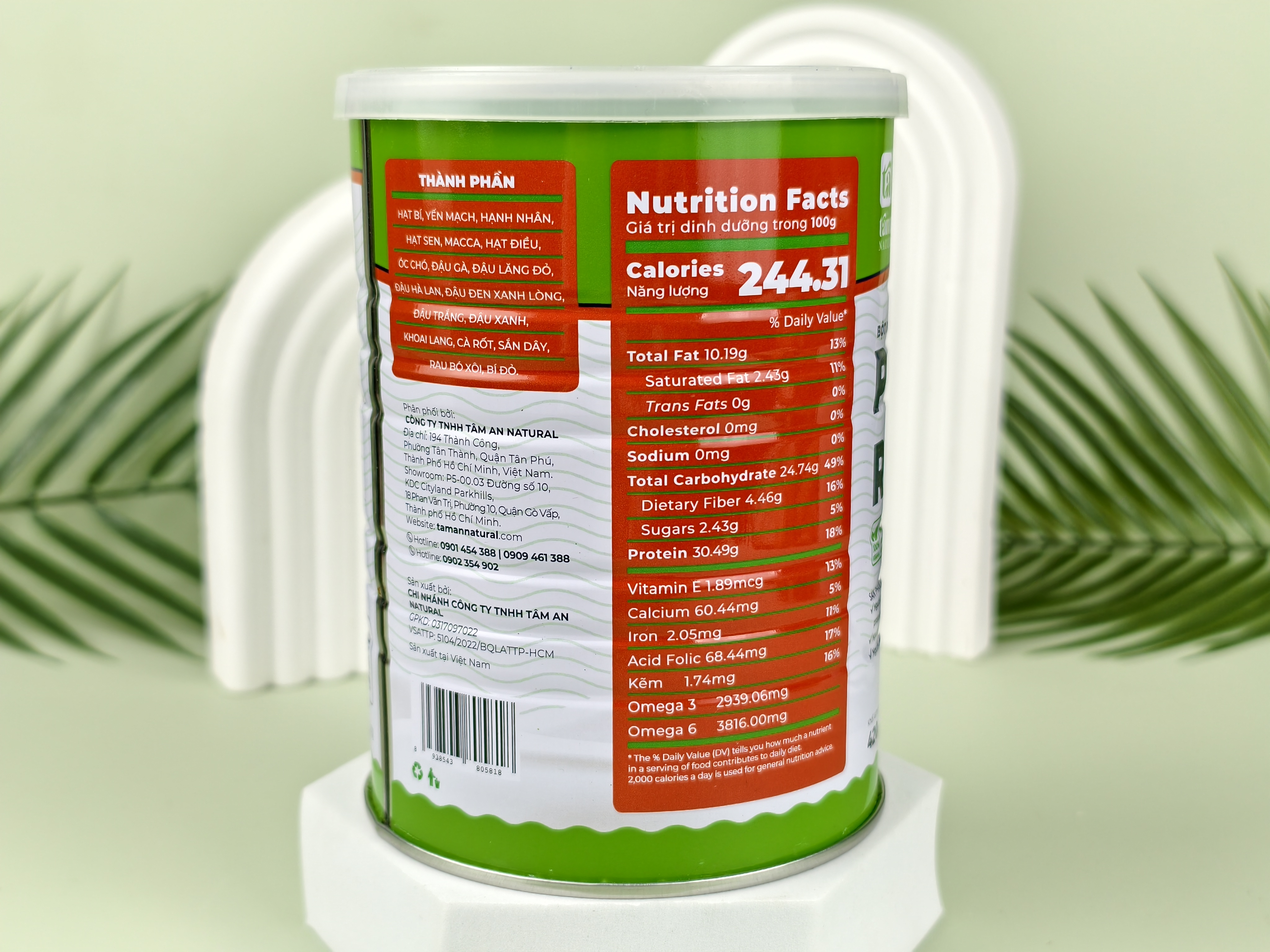 Bột Protein Rau Củ Tâm An Natural là sự kết hợp tuyệt vời giữa các loại hạt dinh dưỡng, đậu giàu protein và rau củ tự nhiên, mang đến giải pháp toàn diện cho sức khỏe. Sản phẩm không chỉ cung cấp nguồn protein thực vật thuần chay mà còn bổ sung collagen thực vật, chất xơ và dưỡng chất thiết yếu, giúp cơ thể bạn luôn khỏe mạnh, săn chắc và tràn đầy năng lượng.