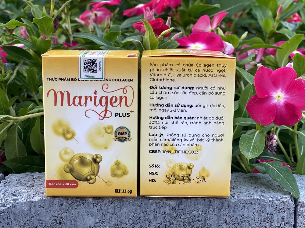 Thực phẩm bổ sung viên uống collagen Marigen Plus - Tre Vang là một sản phẩm của Cty TNHH Tre Vang, được sản xuất tại Việt Nam từ collagen thủy phân từ cá tra. Sản phẩm có công dụng bổ sung collagen cho cơ thể, giúp làm đẹp da, chống lão hóa, tăng cường sức khỏe xương khớp, tóc và móng tay. Mỗi viên uống còn chứa vitamin E, giúp làm chậm quá trình lão hóa và dưỡng da hiệu quả. Sản phẩm được kiểm định hiệu quả lâm sàng tại Cục Quản Lý Thực Phẩm Tự Nhiên (NHPD) Canada.