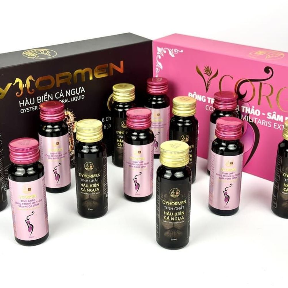 Bộ sản phẩm Combo Xuân Hạnh Phúc: OYHORMEN - VCORGIN bao gồm hai sản phẩm: OYHORMEN (tinh chất hàu biển và cá ngựa) và VCORGIN (đông trùng hạ thảo và sâm ngọc linh).
