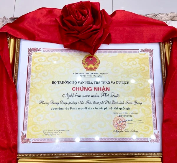 Sáng 16-12, tại TP. Phú Quốc, UBND tỉnh Kiên Giang tổ chức lễ đón nhận bằng di sản văn hóa phi vật thể quốc gia “Nghề thủ công truyền thống, tri thức dân gian nghề làm nước mắm Phú Quốc”.