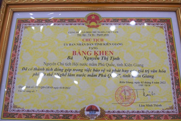 Các doanh nghiệp, cơ sở sản xuất nước mắm truyền thống Phú Quốc chụp hình kỷ niệm cùng bằng chứng nhận di sản văn hóa phi vật thể quốc gia “Nghề thủ công truyền thống, tri thức dân gian nghề làm nước mắm Phú Quốc”.