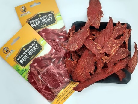 - Thành phần: Thịt bò 100%, muối, đường, nước mắm, tiêu, tỏi, sả, ớt và ngũ vị hương , không có quá nhiều phụ gia hoặc hương liệu nhân tạo.