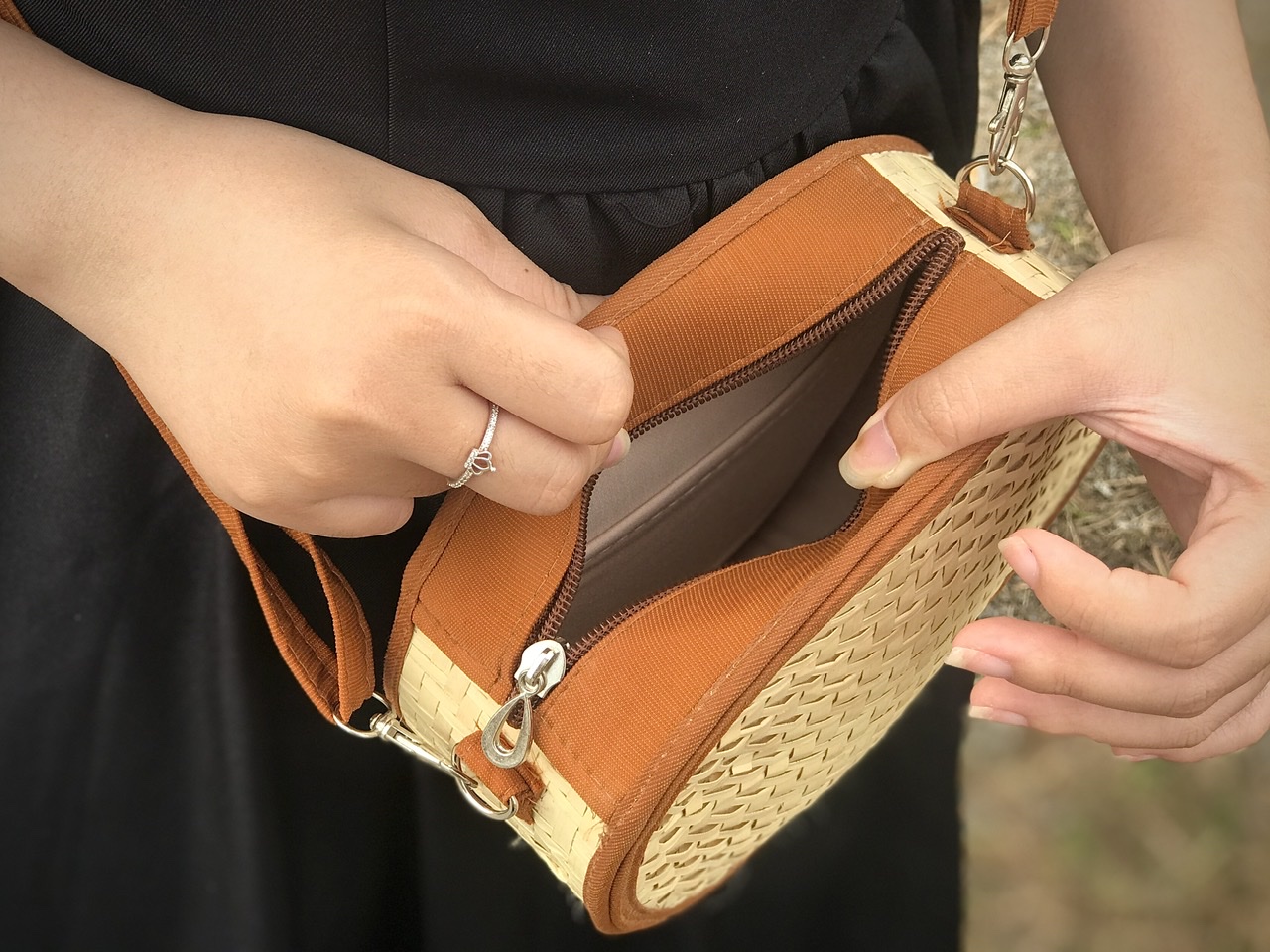 Túi buông hình trống là một sản phẩm được làm từ 100% sợi cỏ buông tự nhiên, được làm thủ công bằng bàn tay các nghệ nhân lành nghề, sợi buông được phơi khô và mang đan bằng tay, sản phẩm đòi hỏi tự tỉ mỉ, lành nghề và có tâm, túi có dây kéo giúp bạn để đồ đạc, tư trang an toàn