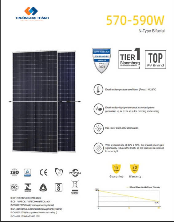 Công suất mạnh mẽ 590Wp: Tối ưu hóa sản lượng điện cho mỗi mét vuông lắp đặt.