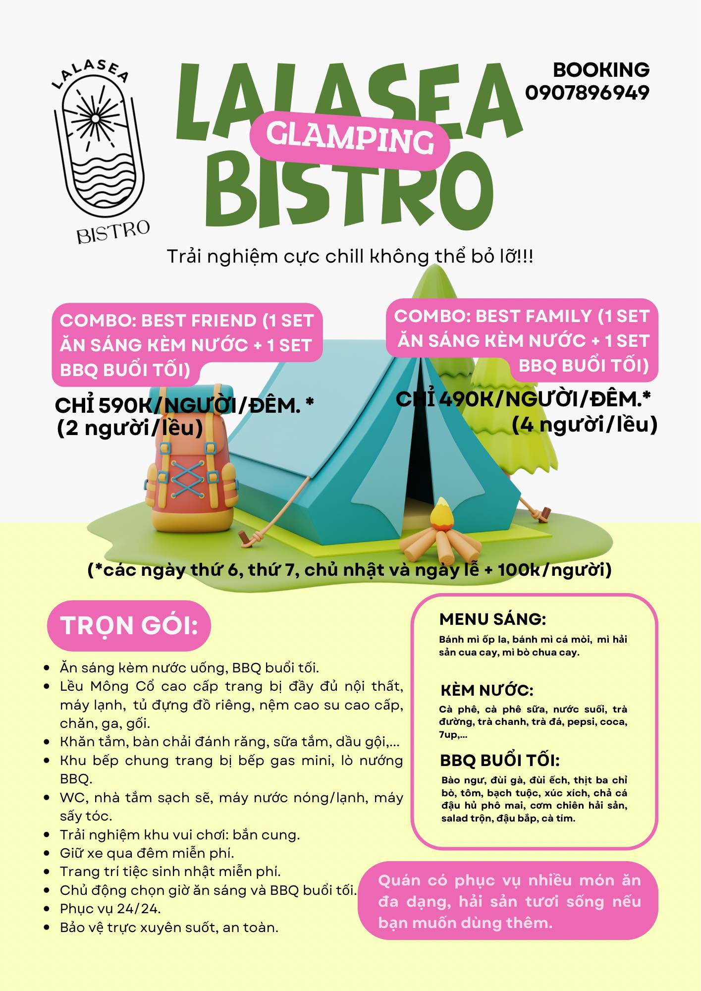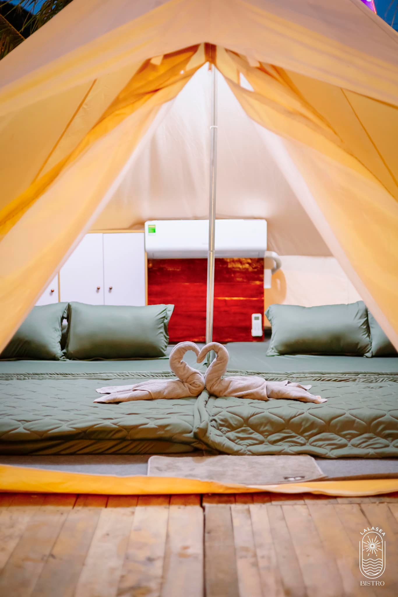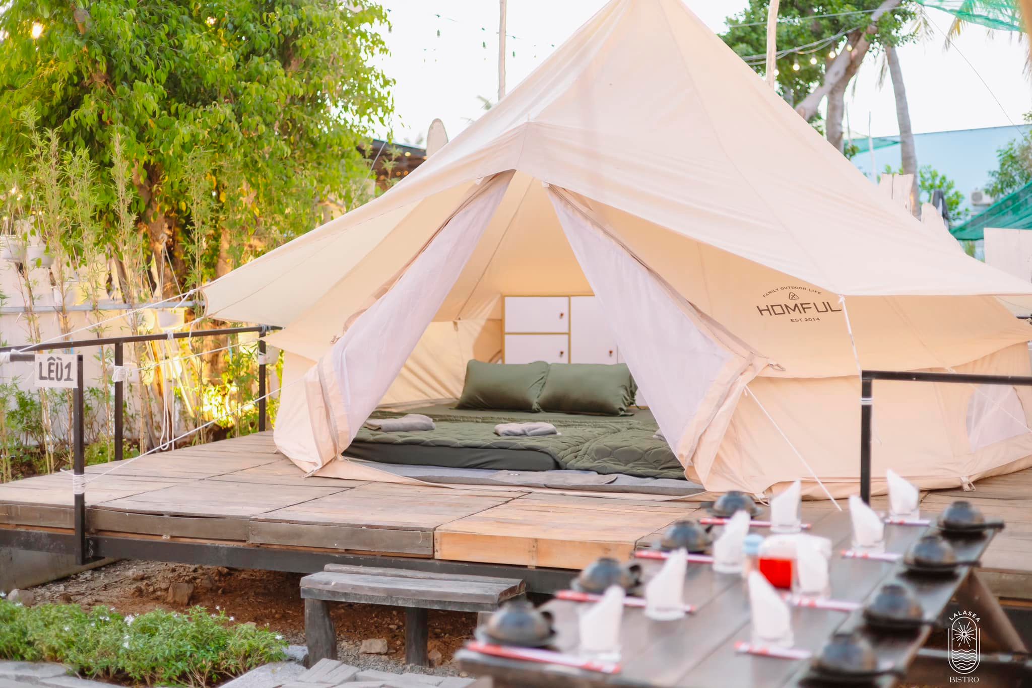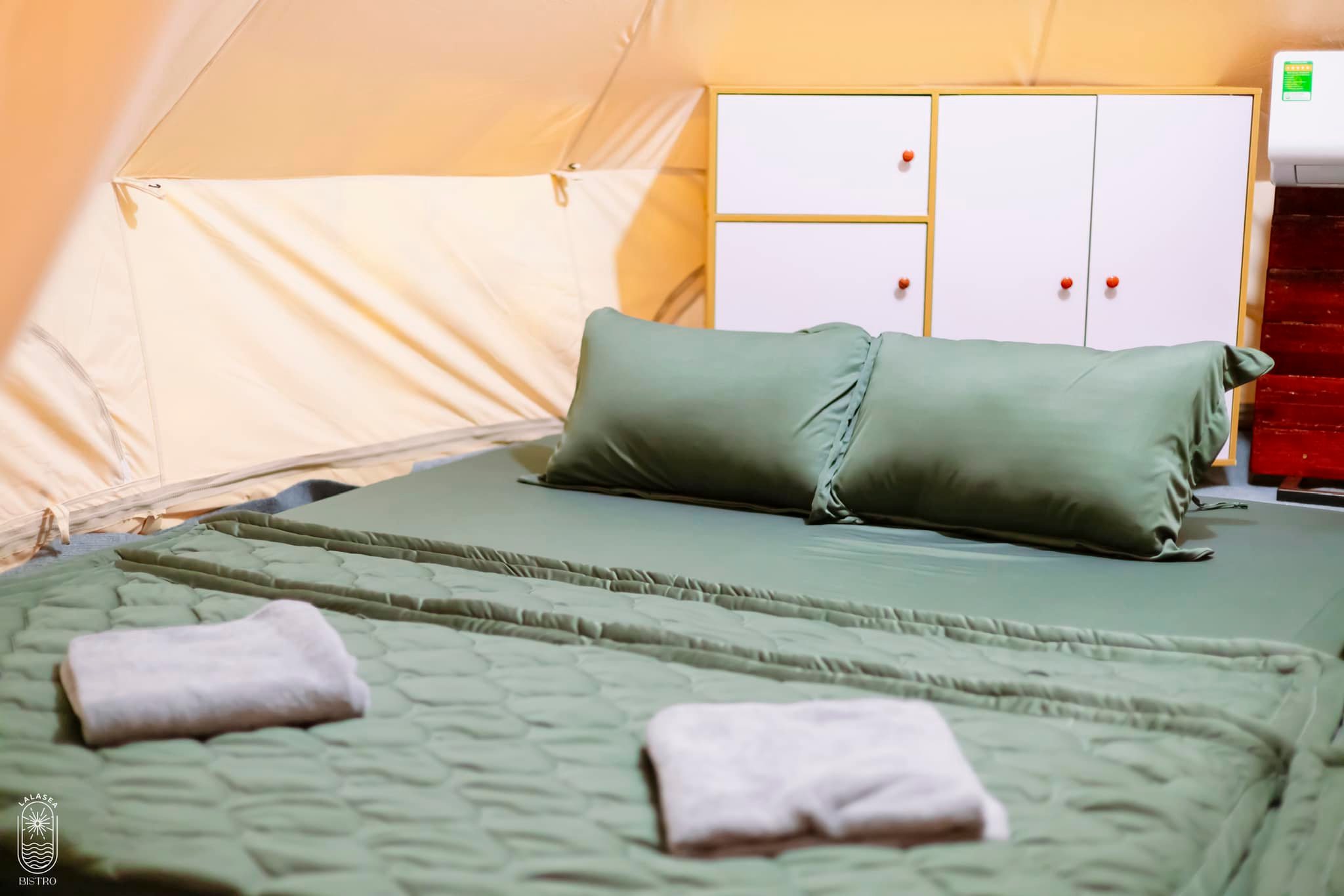 Tại Lalasea Bistro Hà Tiên quý khách được nghỉ ngơi với Lều Mông Cổ cao cấp trang bị đầy đủ nội thất như máy lạnh, tủ đựng đồ riêng, ... để đón chào ánh bình minh ở biển Hà Tiên xinh đẹp.