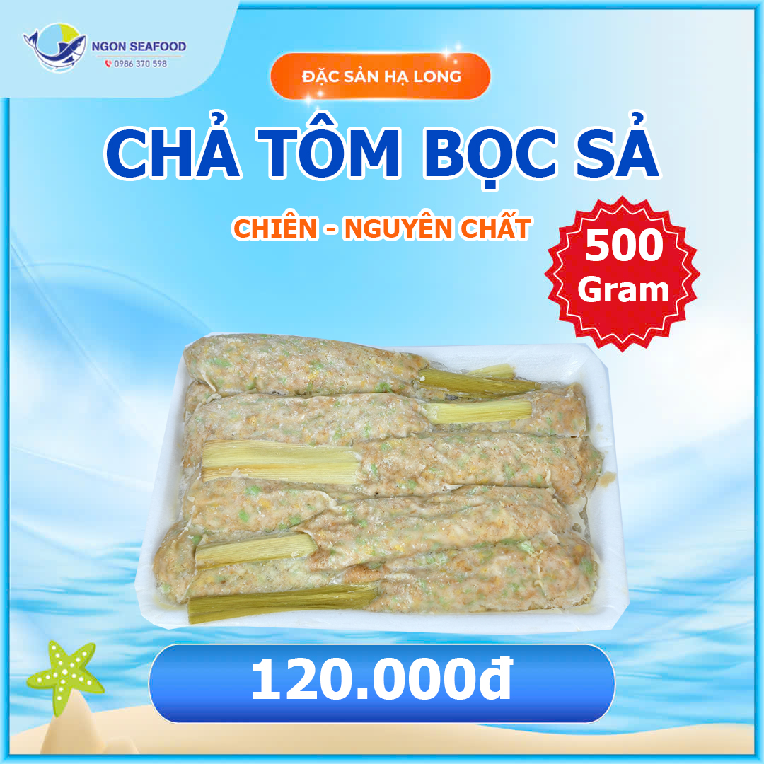 Chả tôm bọc sả – Khay 500g – 120,000đ: Tôm xay nhuyễn quấn quanh cây sả, thơm và béo ngọt.