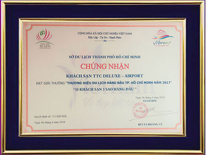 KHÁCH SẠN TTC DELUXE - AIRPORT VINH DỰ ĐẠT GIẢI THƯỞNG "THƯƠNG HIỆU DU LỊCH HÀNG ĐẦU TP.HCM - TOP 10 KHÁCH SẠN 3 SAO HÀNG ĐẦU"