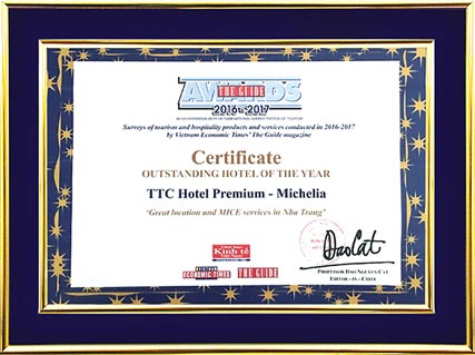 Công ty Cổ phần du lịch Thắng Lợi - TTC Hotel Premium – Michelia vinh dự đạt danh hiệu “THE GUIDE AWARDS 2016 – 2017 – KHÁCH SẠN CÓ VỊ TRÍ ĐẸP VÀ DỊCH VỤ MICE TỐT TẠI NHA TRANG” do Thời báo Kinh tế Việt Nam trao tặng.