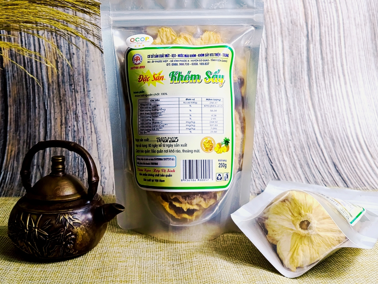 Khóm sấy là một sản phẩm ăn vặt tốt cho sức khỏe, với 100% thành phần là khóm tự nhiên, không chứa chất phụ gia, an toàn tuyệt đối cho người sử dụng.